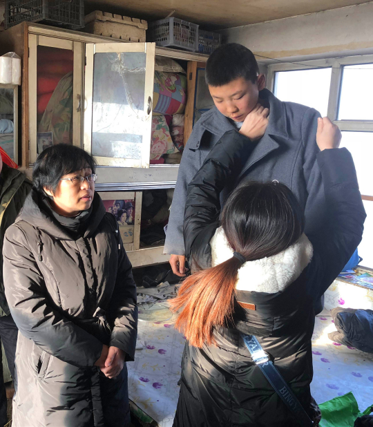 市工信局机关党委专职副书记李英环深入贫困户家中慰问贫困户,并为贫困户儿童送去过冬的御寒衣物